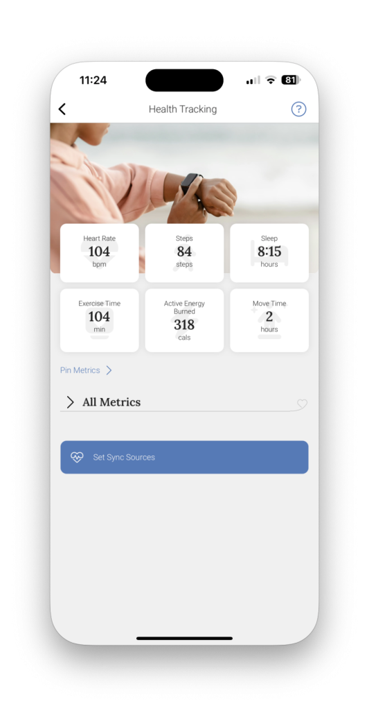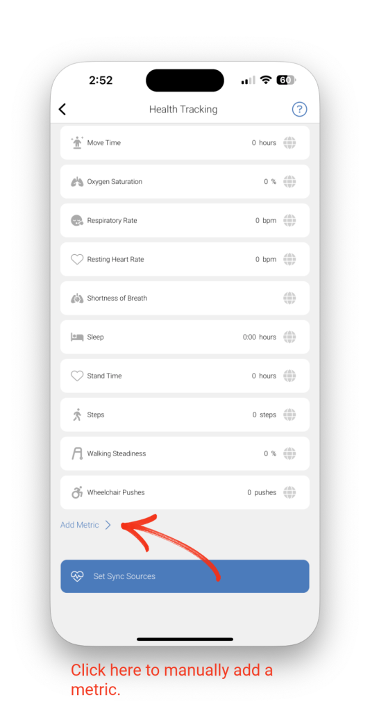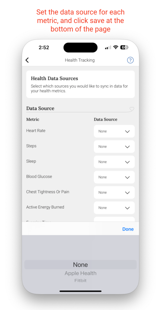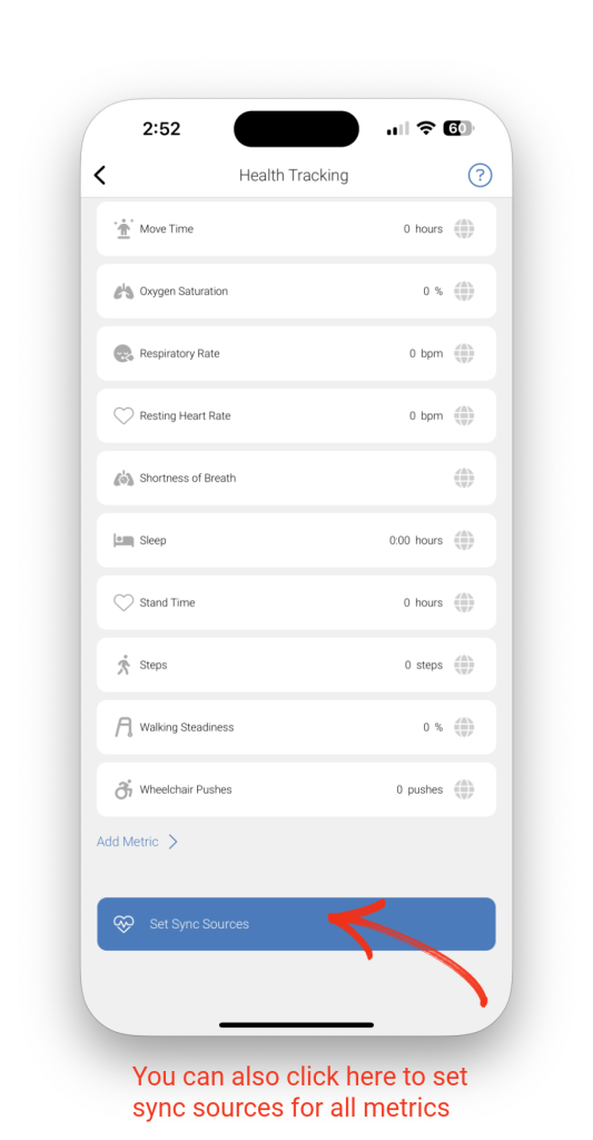 You can also scroll to the bottom of the metrics page and mass select where your health data syncs from. Simply click “set sync sources” and select Apple Health or Fitbit for each metric from the list and click save.