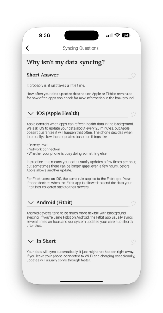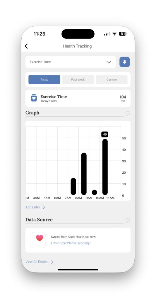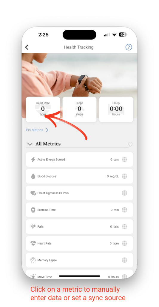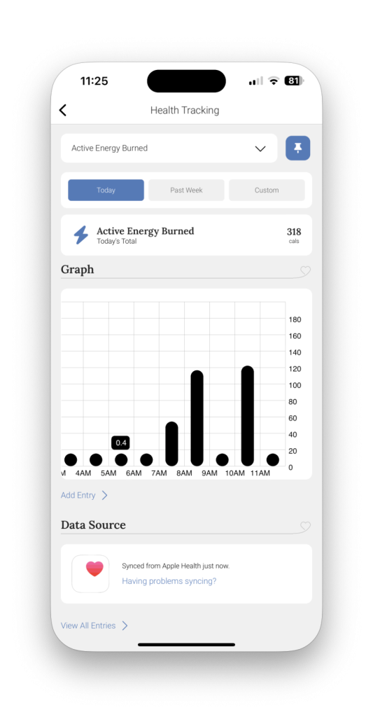 Once you’ve synced your health tracking device with the app, your health data will start populating soon. Once it does, you’ll be able to see any metric you’ve synced, and the associated data will show up in graphs.