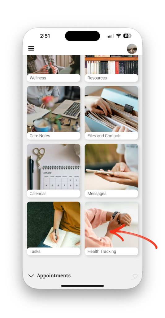 To get started, scroll to the bottom of the module tiles and select health tracking.