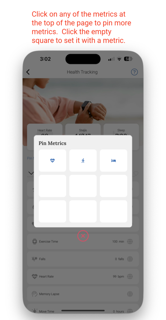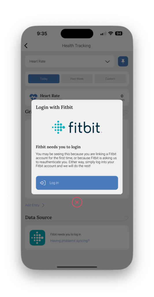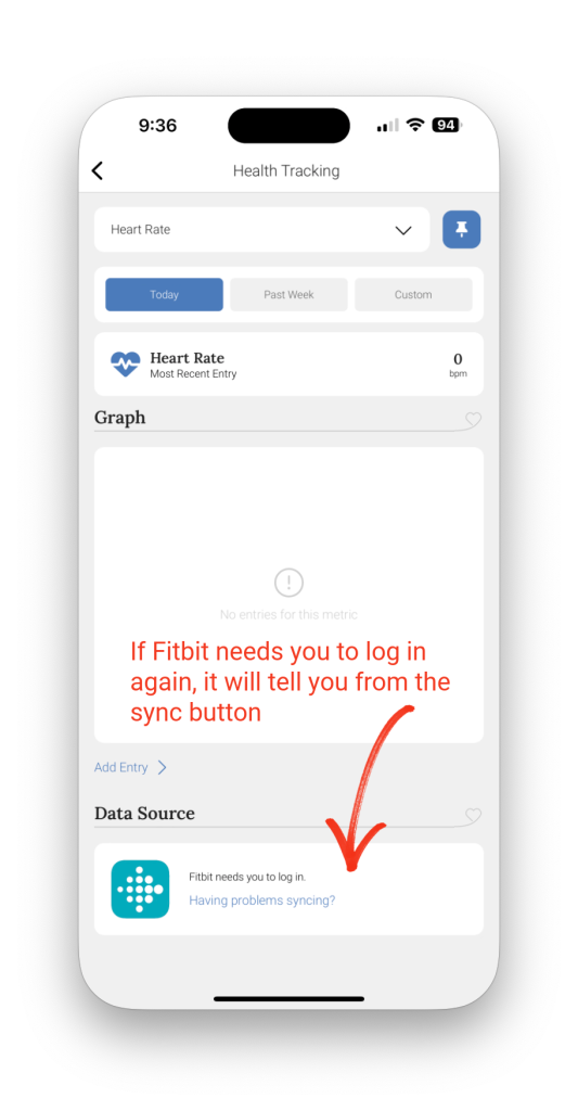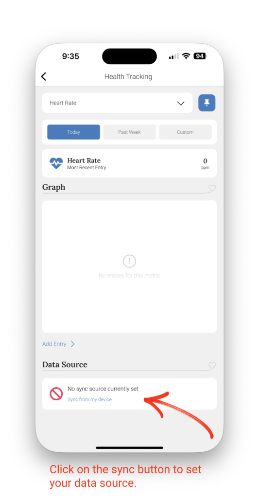 To add a fitness tracking device (such as a Fitbit or Apple Watch) click on the metric and scroll to the bottom of the page. Under Data Source, click on the white button to select your sync source. Follow the prompts from here.
